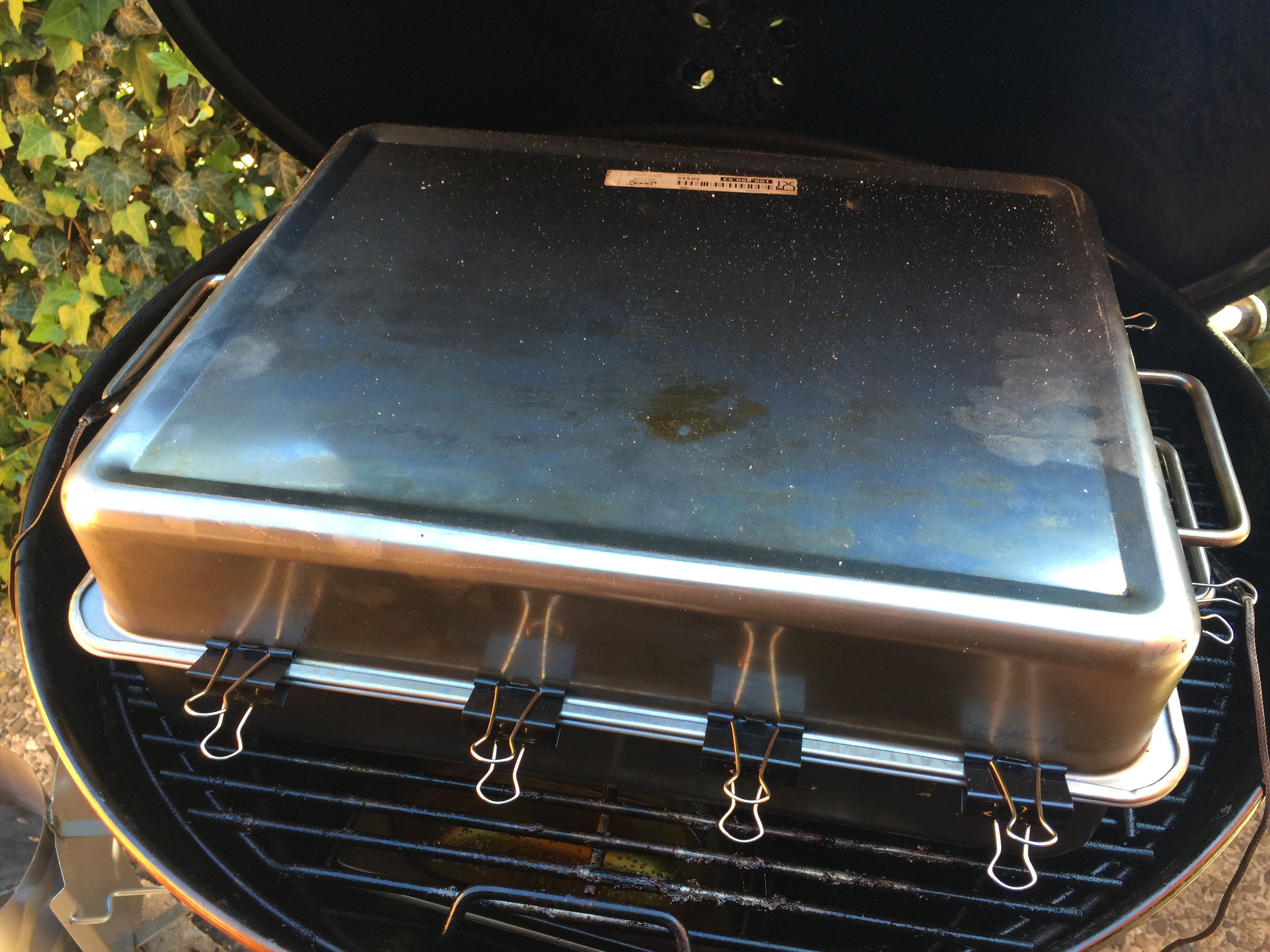 Das ganze Stellen wir dann wieder auf den Grill in die Indirekte Zone und schliessen wieder den Deckel für 2 Stunden. Die Temperatur dabei zwischen 110-120 Grad halten. Für diese Phase benötigen wir keinen Rauch mehr.