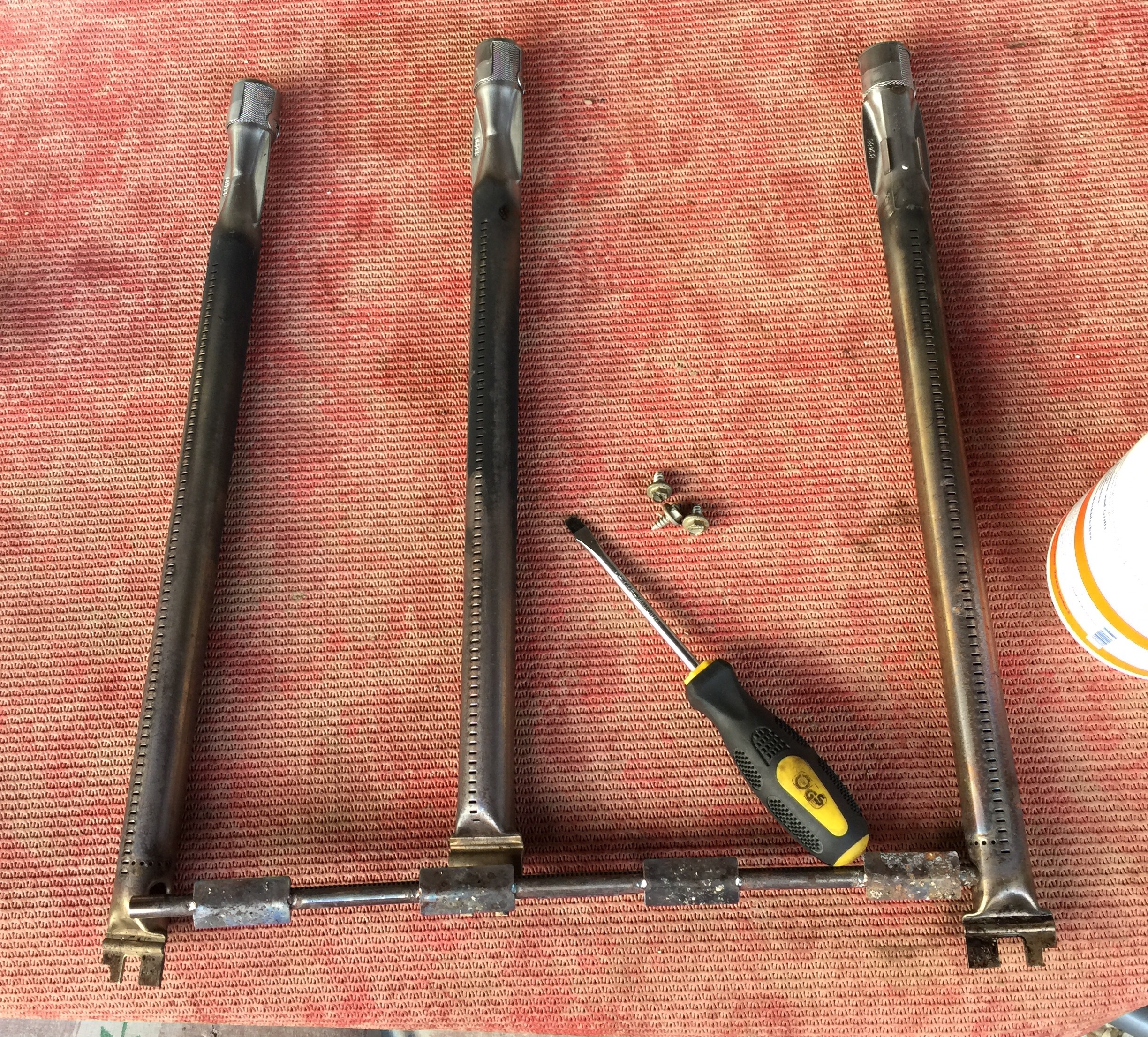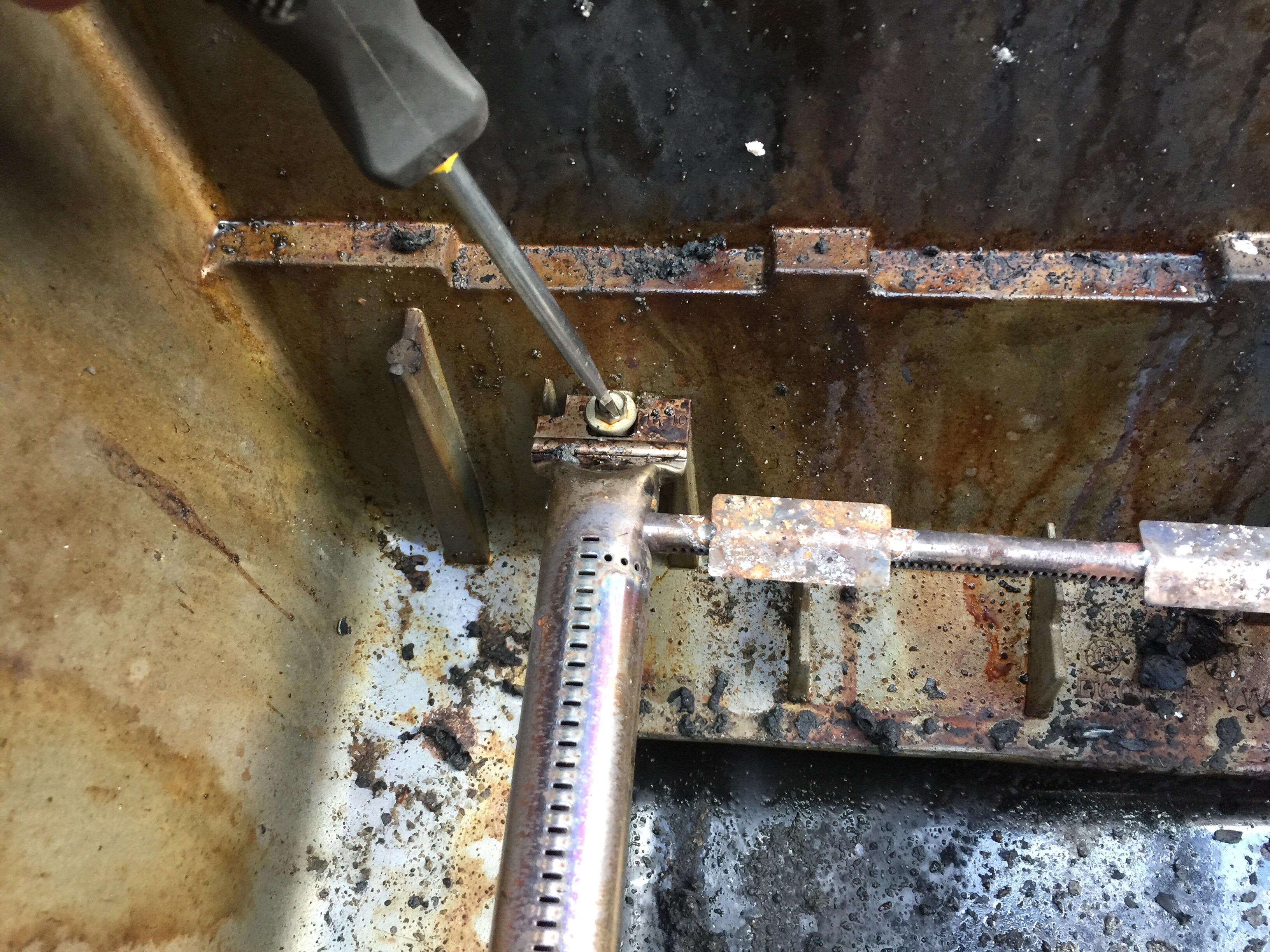 Als erstes entnehme ich das Grillrost und die Flavour Bars und löse die 3 vorhandenen Schrauben der Brennerelemente mit einem Schlitzschraubendreher und lege diese bei Seite.