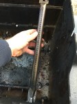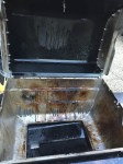 Als nächsten Schritt entferne ich leicht zu entfernende Stücke aus der Wanne zum Beispiel mit einem Holzspachtel und entnehme die Fettauffangschale und die Fettablaufschale welche ich separat reinige.