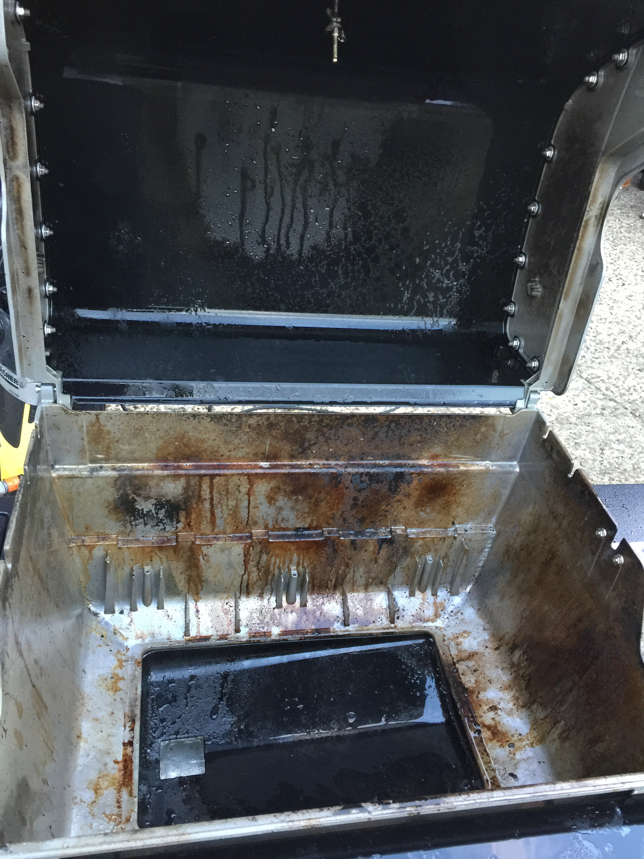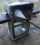 Nach der Einwirkzeit von ca 10min gehe ich mit mittlerer Krafteinstellung des Hochdruckreinigers den Schmutz an den Kragen. In ausreichendem Abstand, nicht zu nah dran reinige ich erst die Roste, entnehme diese und reinige dann die FlavourBars. Als nächstes gehe ich dann durch den Garraum und die Außenwände und sprühe mit weitem Abstand nochmal alles über.