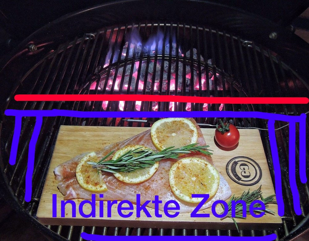 Beim indirekten Grillen platzieren wir unser Grillgut nicht direkt über den glühenden Kohlen sondern dort wo sich keine Kohlen unter dem Rost befinden, entweder direkt auf dem Rost oder zum Beispiel auf einer Holzplanke oder einer Salzplanke. Das Grillgut wird somit nur durch die heiße Luft gegart (in Fachkreisen auch Konvektionshitze genannt).