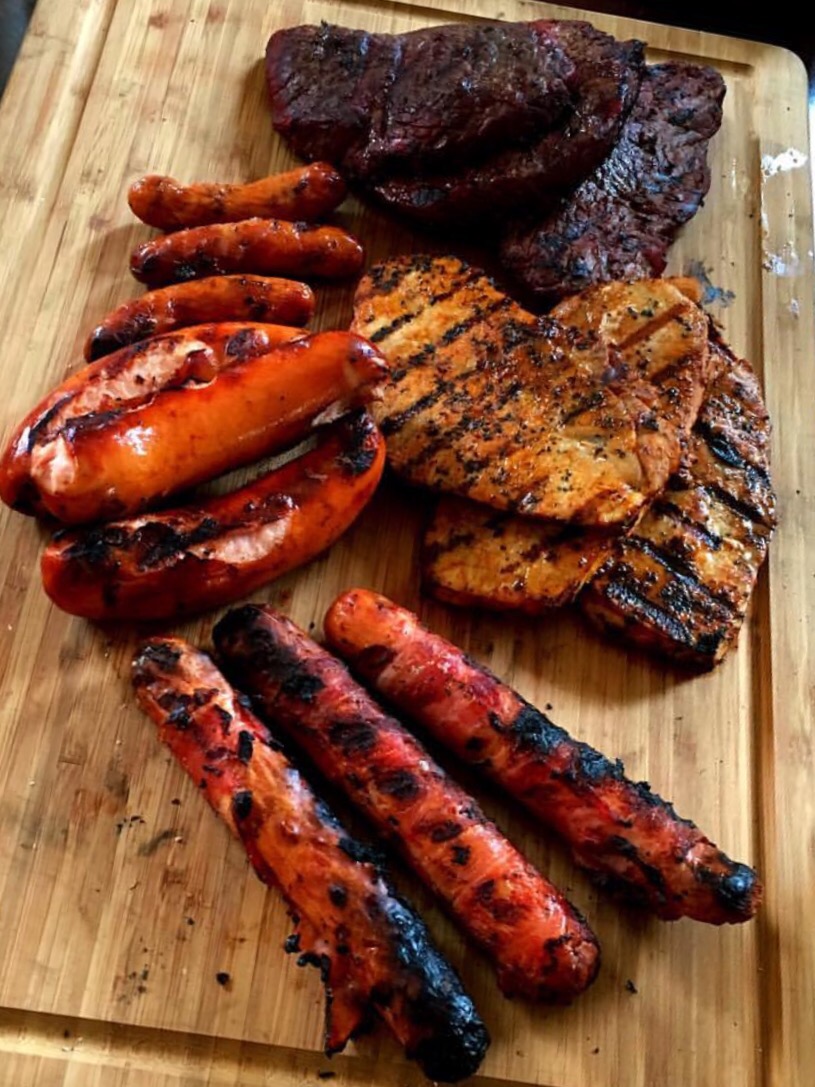 Jetzt ist es endlich soweit, alles ist abgegrillt und kann verschlungen werden. Die verbrannten Stellen werden abgeschnitten oder liegen gelassen, Bratwürste werden in Ketchup oder Senf ertränkt und das Steak wird angeschnitten, obduziert, siziert und da es noch blutig/rosé ist, noch einmal 10 Minuten auf den Grill von beiden Seiten „durch“ gebraten, um es danach mit einer halben Rolle Kräuterbutter zu verschlingen.