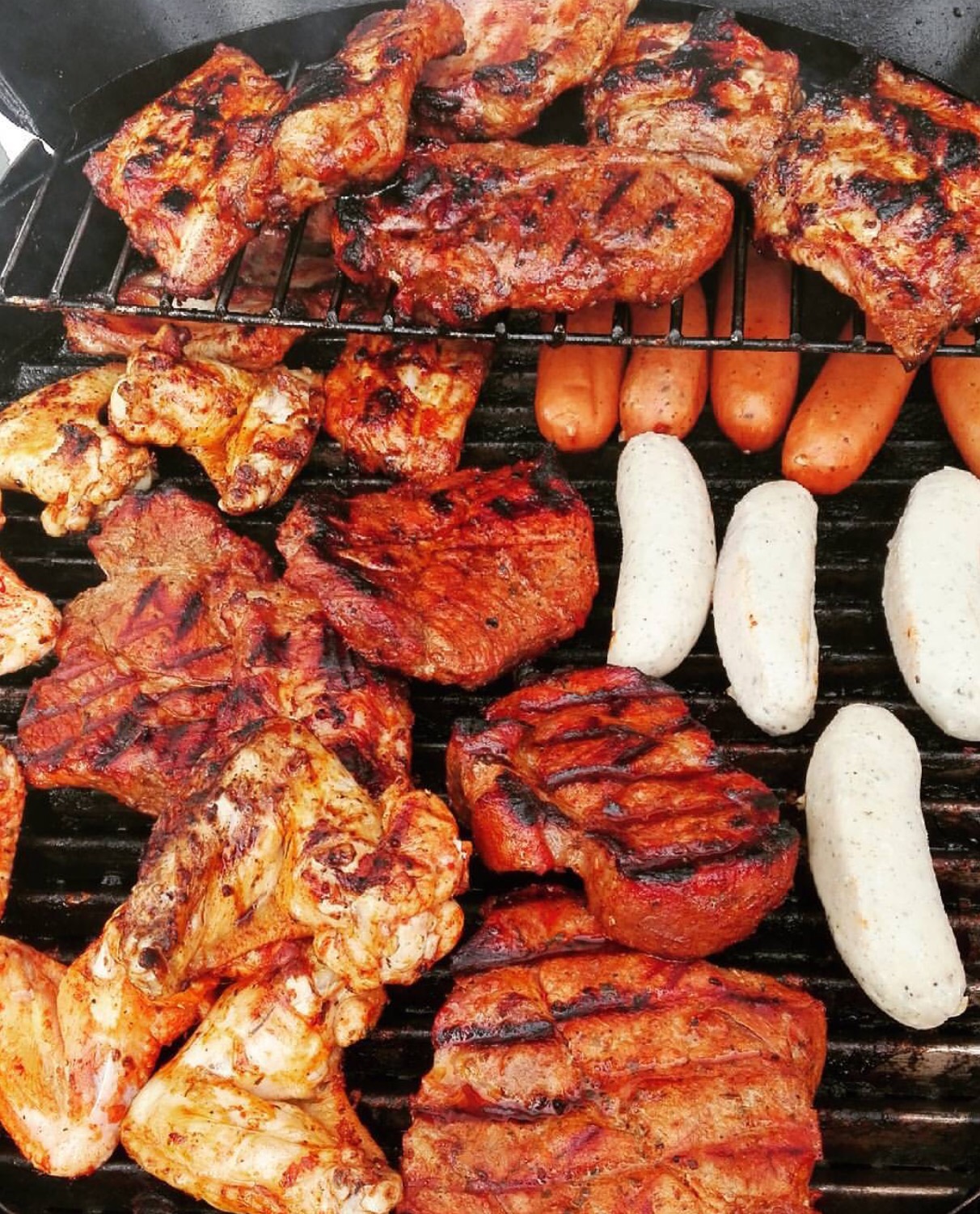 Da alles zur gleichen Zeit fertig sein soll und da alle zusammen essen wollen, wird das bereits fertige Grillgut auf dem Rost übereinander gestapelt oder schon auf einem Teller neben dem Grill zusammen gefercht, um das nächste Fleisch aufzulegen.