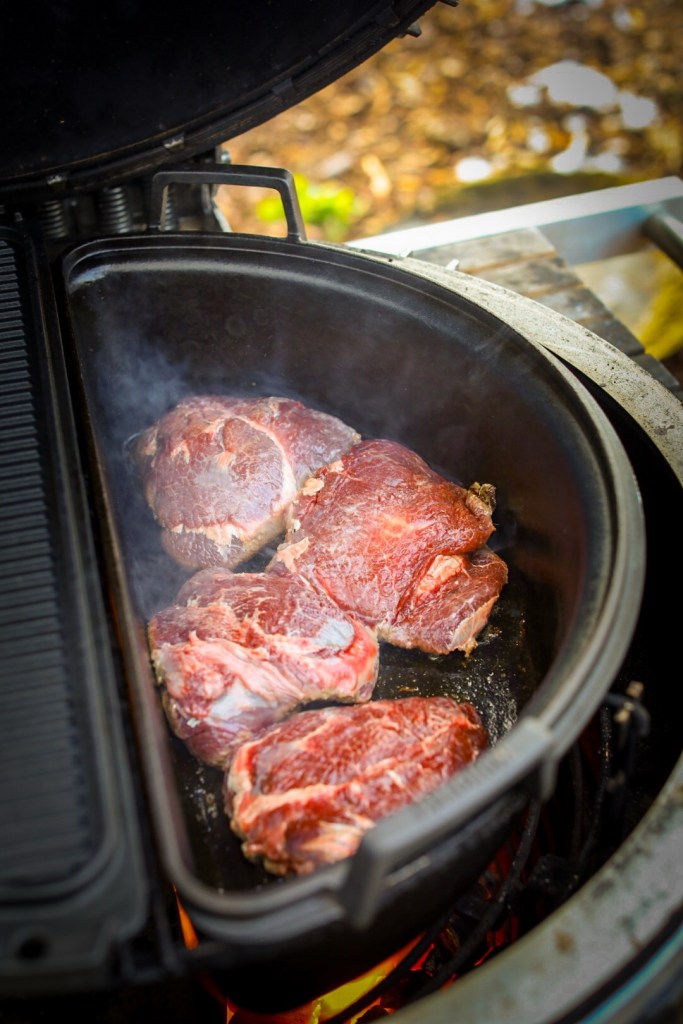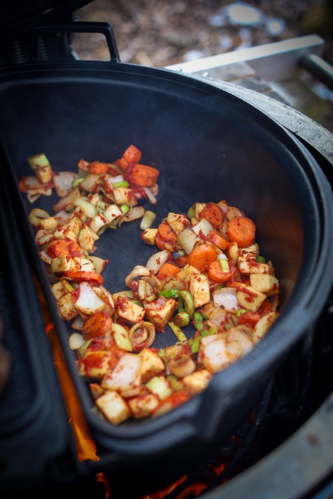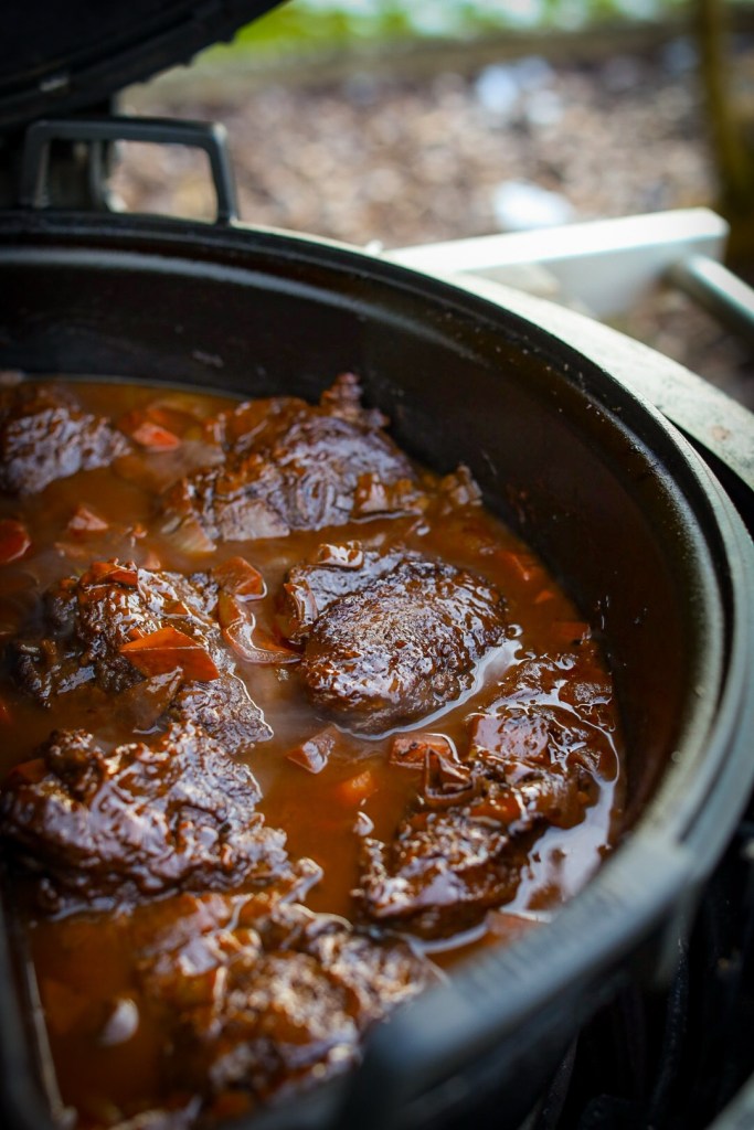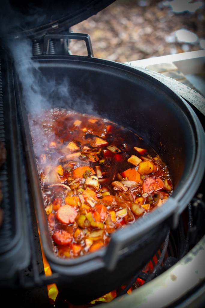 Den Deckel auflegen und den Feuertopf für ca. 3 bis 3,5 Stunden bei indirekter Hitze schmoren lassen. Dabei gelegentlich kontrollieren, ob noch genug Flüssigkeit vorhanden ist. Die Glut sollte konstant gehalten werden – nicht zu heiß, lieber gemächlich und gleichmäßig.