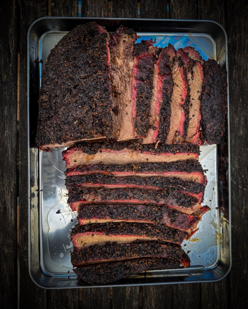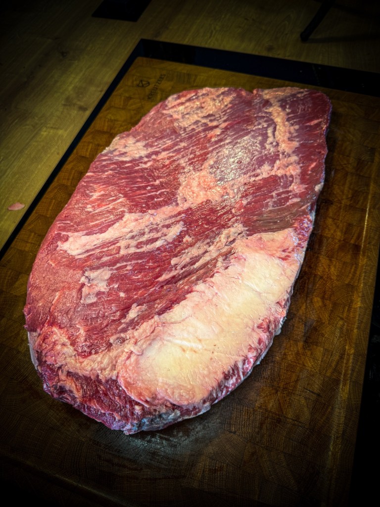 Gegen die Faser schneiden! Achte darauf, wo sich Flat und Point treffen – die Faserrichtung ändert sich hier. Schneide das Flat in dünne Scheiben, das Point eignet sich auch perfekt für saftige Burnt Ends.
