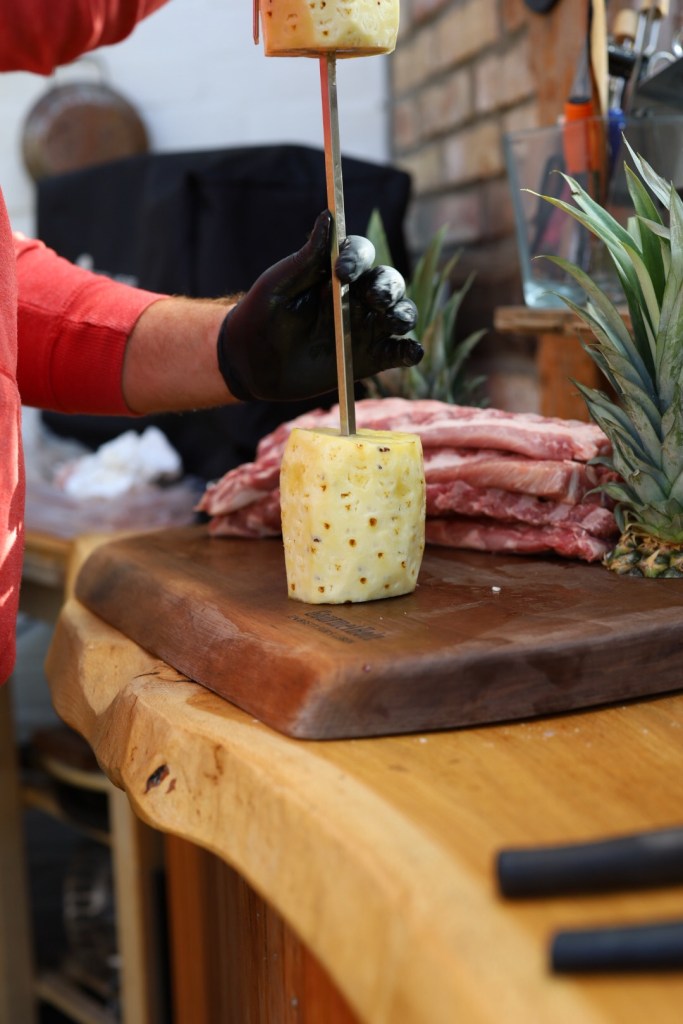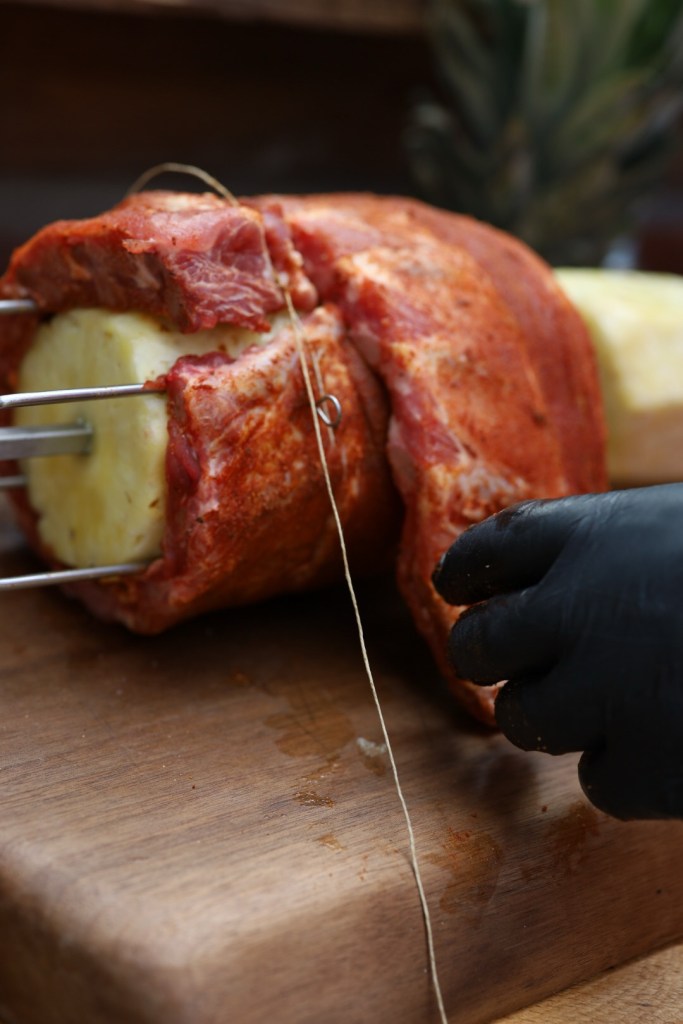 Jetzt wird’s spektakulär: Spieße abwechselnd ein Stück Ribs, dann ein Stück Ananas auf den Rotisserie-Spieß. Alternativ kannst du die Ananas ganz lassen und die Ribs „um sie herum“ befestigen. So entsteht der berühmte “Flying Pineapple”-Look – die Ribs drehen sich optisch wie Flügel um die Ananas.