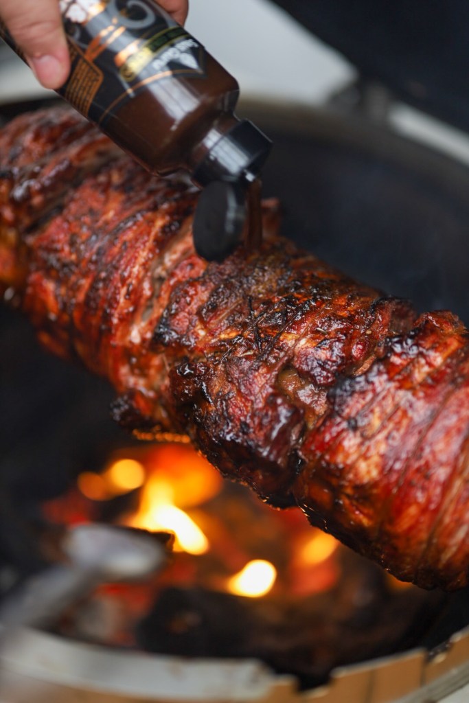 Platziere den Spieß in der Rotisserie-Halterung und grille das Ganze bei ca. 160–180 °C indirekter Hitze für etwa 2 bis 2,5 Stunden. Die Ribs sollen zart werden, aber nicht zerfallen. In den letzten 20 Minuten pinselst du die Ribs regelmäßig mit BBQ-Sauce ein – so entsteht die perfekte Glaze.