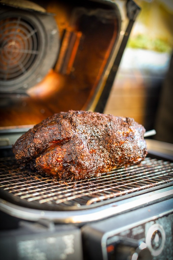 Heize deinen Ninja Woodfire auf 120–130 °C im Smoker-Modus vor. Lege den Schweinenacken direkt auf den Rost. Wenn du magst, kannst du alle 45–60 Minuten etwas Apfelsaft aufsprühen – das bringt extra Saftigkeit und Aroma.