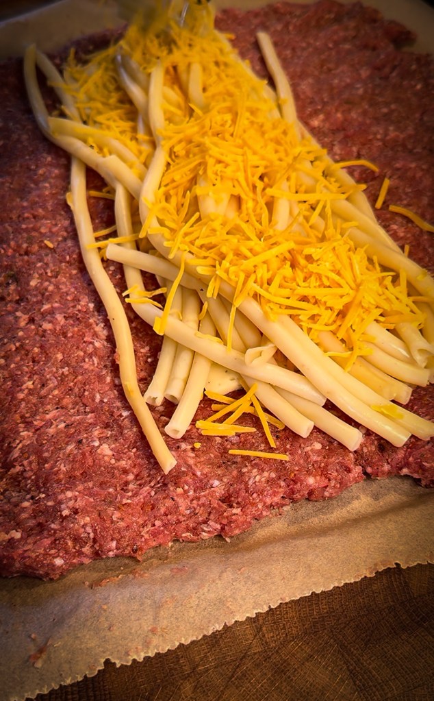 Verteile das Hackfleisch rechteckig auf dem Baconnetz (etwa 1,5–2 cm dick). In die Mitte gibst du die Makkaroni-Käse-Mischung als längliche Rolle. Jetzt vorsichtig die Seiten einklappen und alles zu einer Rolle formen. Mithilfe des Backpapiers den Bacon drumherum wickeln.