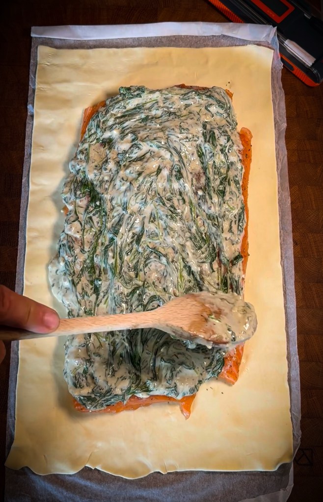 Eine Rolle Blätterteig auslegen, den Lachs darauflegen und die Spinatmasse verteilen. Dann mit der zweiten Blätterteigrolle abdecken und alles gut verschließen. Ränder gut zusammendrücken, mit Ei bestreichen und nach Belieben mit einem Messer leicht einritzen – das sieht später richtig edel aus!