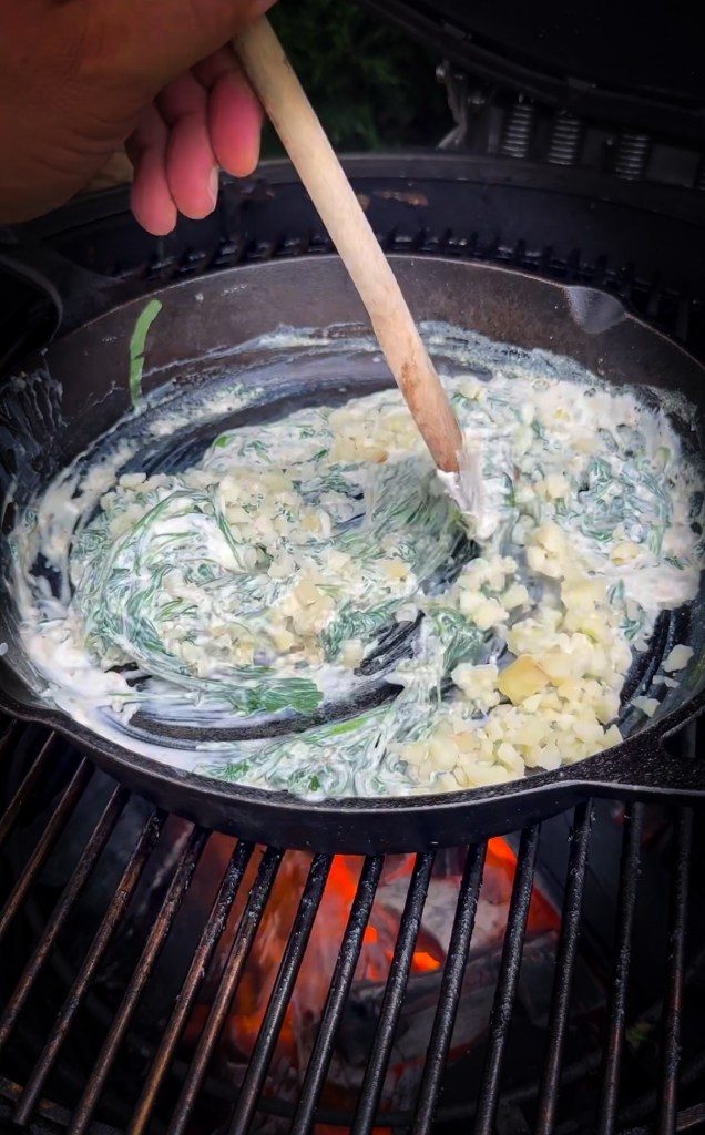 Schalotten und Knoblauch fein hacken und in etwas Öl glasig anschwitzen. Den gewaschenen Spinat hinzufügen und zusammenfallen lassen. Mit Salz, Pfeffer und etwas frisch gehacktem Dill abschmecken. Anschließend Frischkäse und Parmesan unterrühren – das ergibt eine herrlich cremige Füllung mit ordentlich Geschmack.