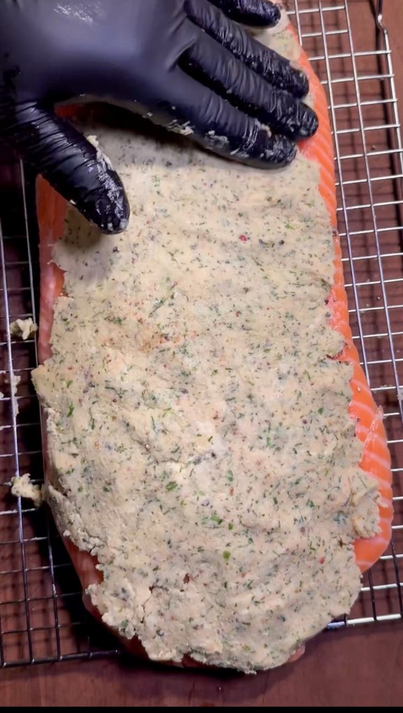 Den Lachs abspülen, trocken tupfen und auf ein Stück Alufolie oder eine Grillplatte mit Hautseite nach unten legen. Die Butter-Kräutermischung gleichmäßig auf dem Fisch verteilen und leicht andrücken.