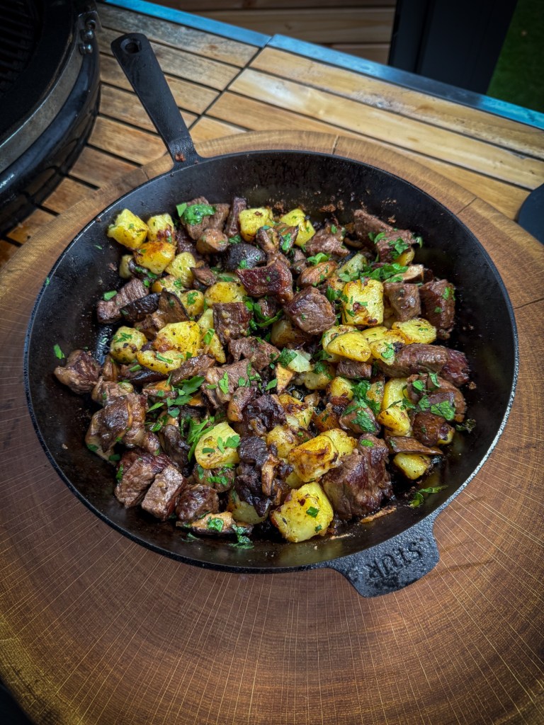 Bratkartoffeln und Steakwürfel zusammen in der Pfanne oder direkt auf dem Grill mischen, frische Petersilie drüberstreuen und noch einmal kurz gemeinsam durchziehen lassen.