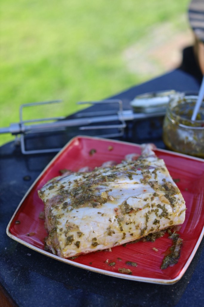 Petersilie, Knoblauch und Chili fein hacken. Mit Olivenöl, Rotweinessig, Salz und Pfeffer vermischen. Das Karree damit einreiben und mindestens 2 Stunden (besser über Nacht) marinieren.