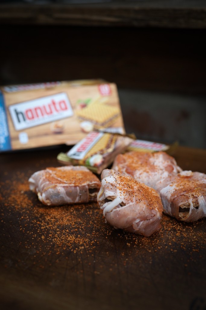 Pro Hanuta nimmst du zwei Scheiben Bacon. Wickel sie über Kreuz um das Hanuta, sodass es vollständig eingepackt ist. Fixiere das Ganze mit Zahnstochern oder BBQ-Nadeln, damit beim Grillen nichts verrutscht.