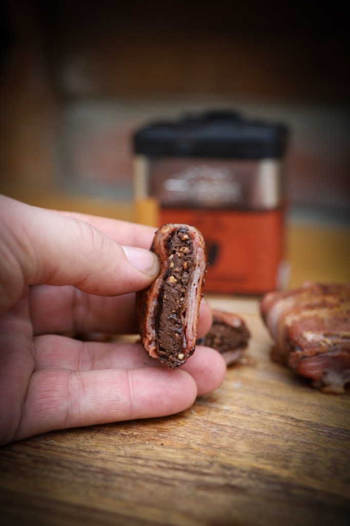 Die Bacon-Hanutas indirekt grillen – etwa 10–12 Minuten, bis der Bacon knusprig ist und die Schokolade im Inneren beginnt zu schmelzen. Vorsicht beim Wenden, damit sie nicht aufreißen!