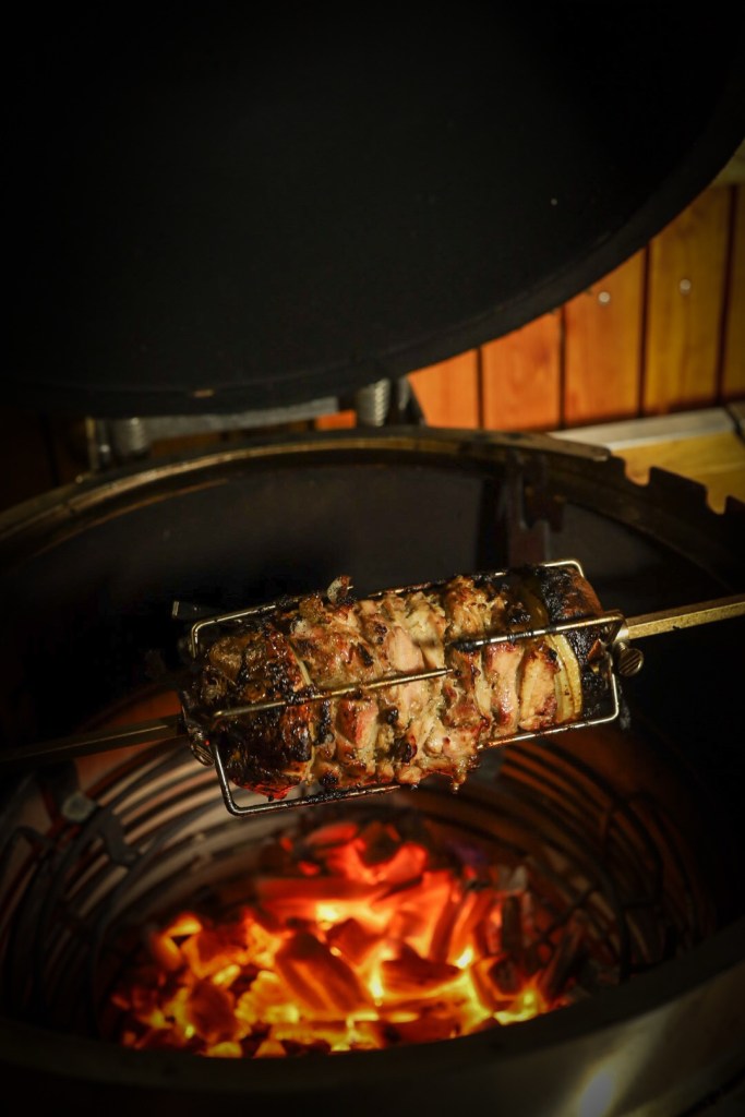 Den Grill mit Rotisserie auf ca. 180–200 °C indirekte Hitze vorbereiten. Eine Tropfschale unter dem Spieß auffangen hilft, Fett und Marinade sauber aufzufangen.