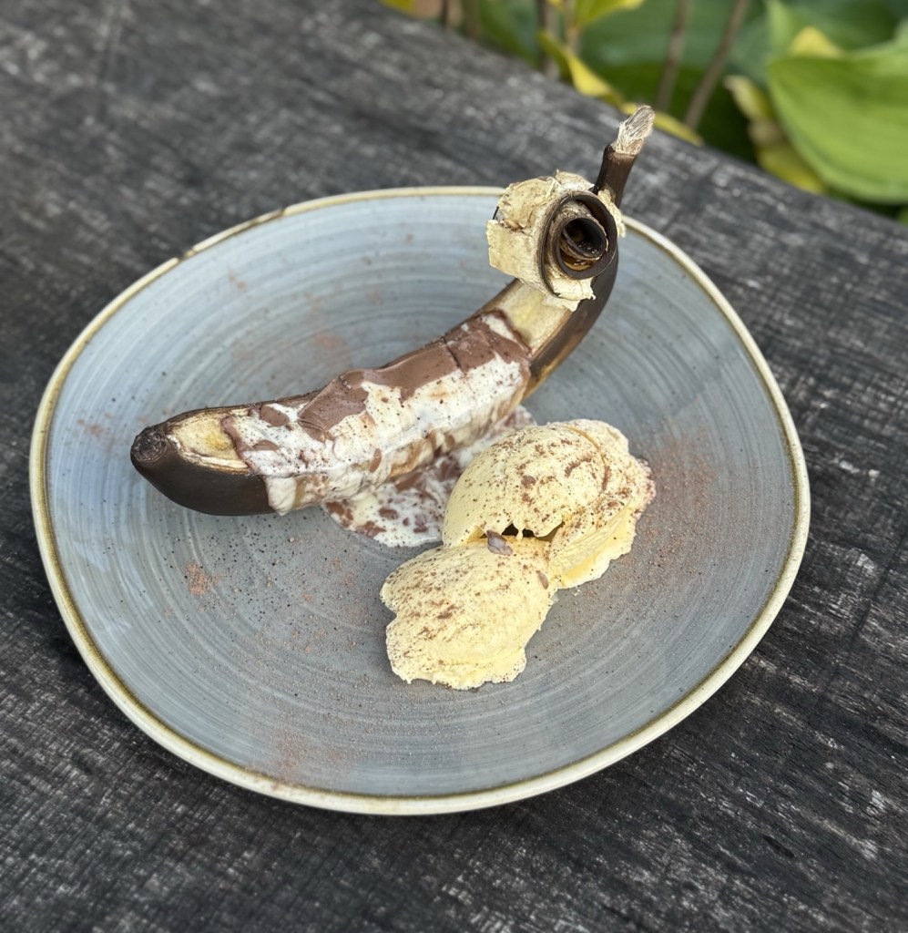 Die gegrillte Banane direkt vom Grill genießen. Besonders lecker wird’s mit einer Kugel Vanilleeis und etwas Zimt oder Kakaopulver als Topping.