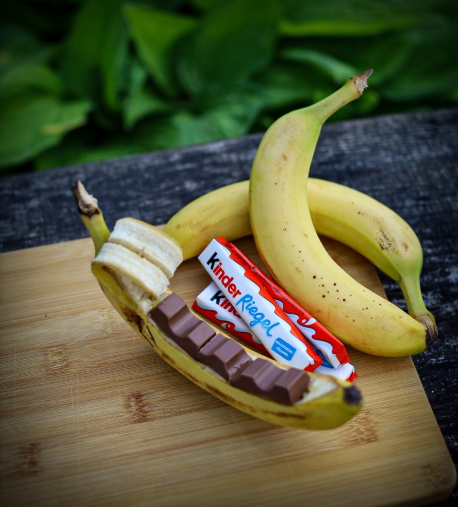 Den Kinderriegel in Stücke brechen und in die vorbereitete Kuhle der Banane legen.
