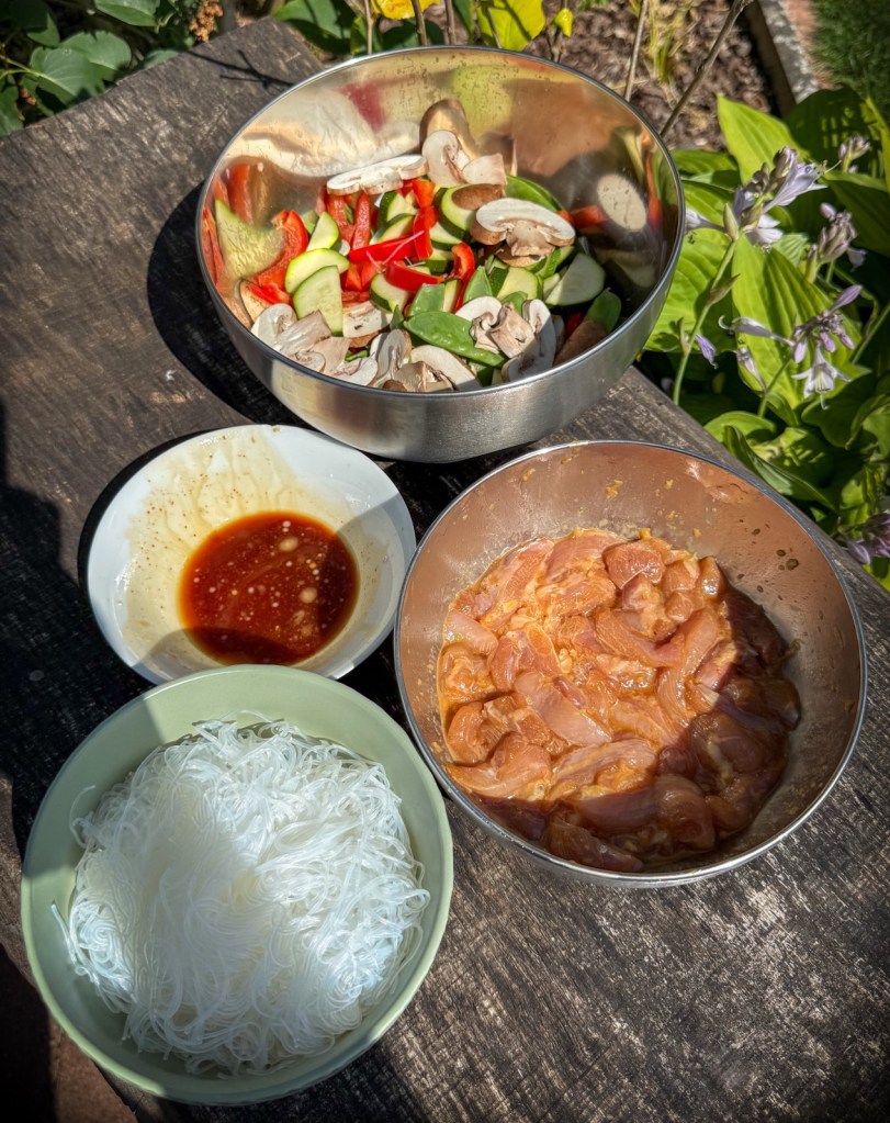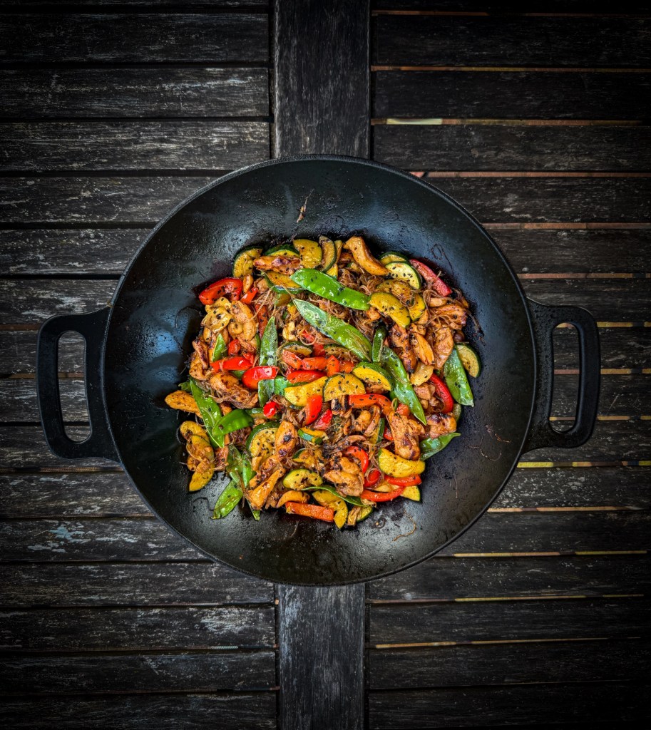 Ich habe das Gericht im Rösle Wok auf dem Rösle allflame Hero 4 zubereitet – bei starker direkter Hitze (z. B. Seitenbrenner). Du kannst natürlich auch einen anderen Grill mit Wok oder eine Herdplatte verwenden.