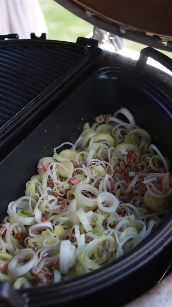 Zwiebel würfeln, Lauch in Ringe schneiden und beides zum Hack geben. Kurz mitrösten, bis der Lauch leicht zusammenfällt.
