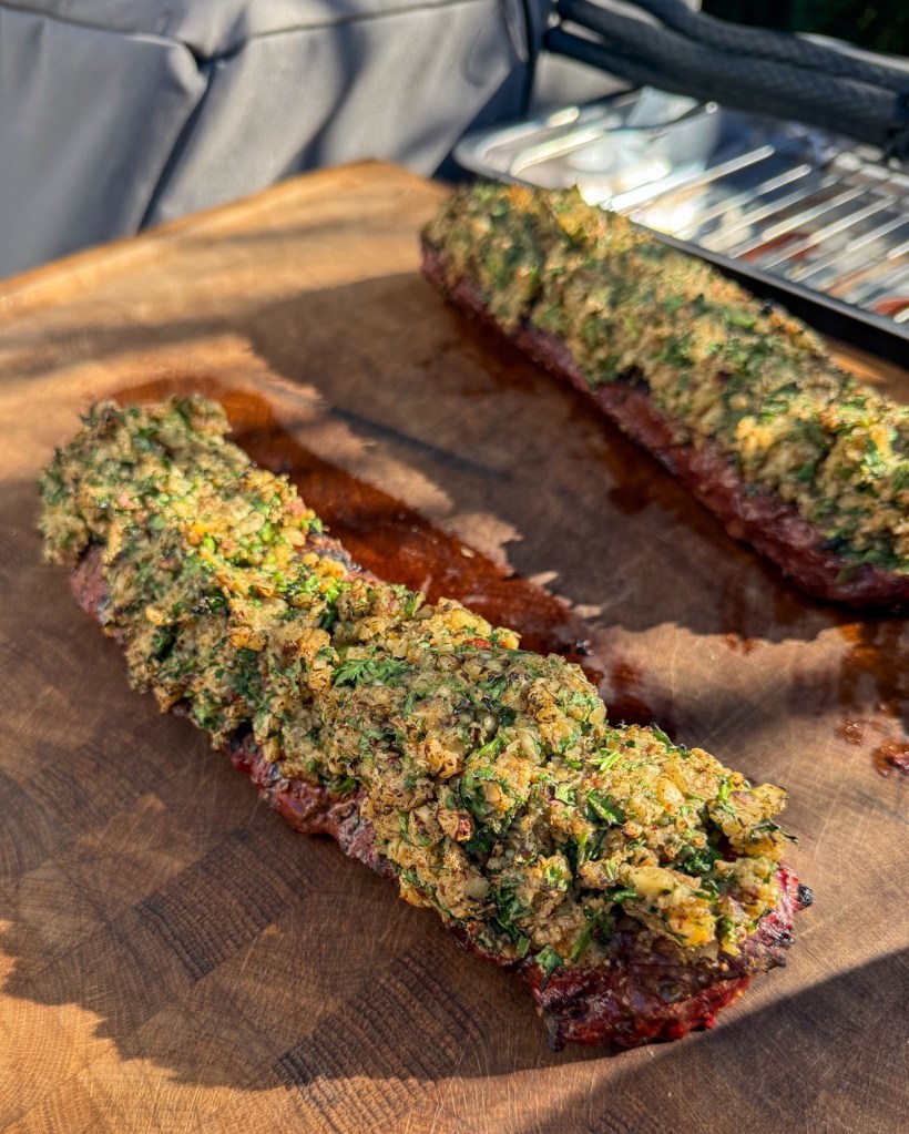 Dieser Hirschrücken mit Kräuterkruste ist nicht nur optisch ein Highlight, sondern auch geschmacklich ein echtes Fest. Die Kombination aus nussiger Kruste, frischen Kräutern und zartem Wildfleisch sorgt für ein unvergessliches BBQ-Erlebnis.